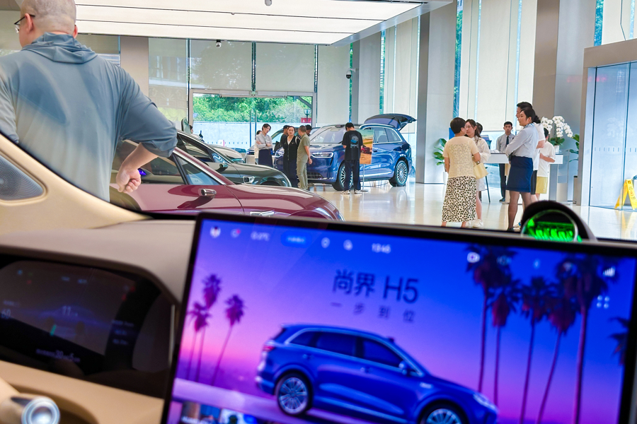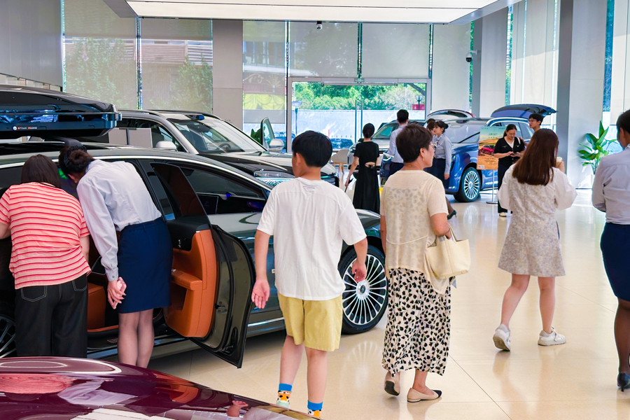 长假首日,记者来到吴中路上的鸿蒙智行多界共网店,节前刚上市的全新问界M7和上汽华为合作新品牌尚界H5吸引了众多意向购车者。