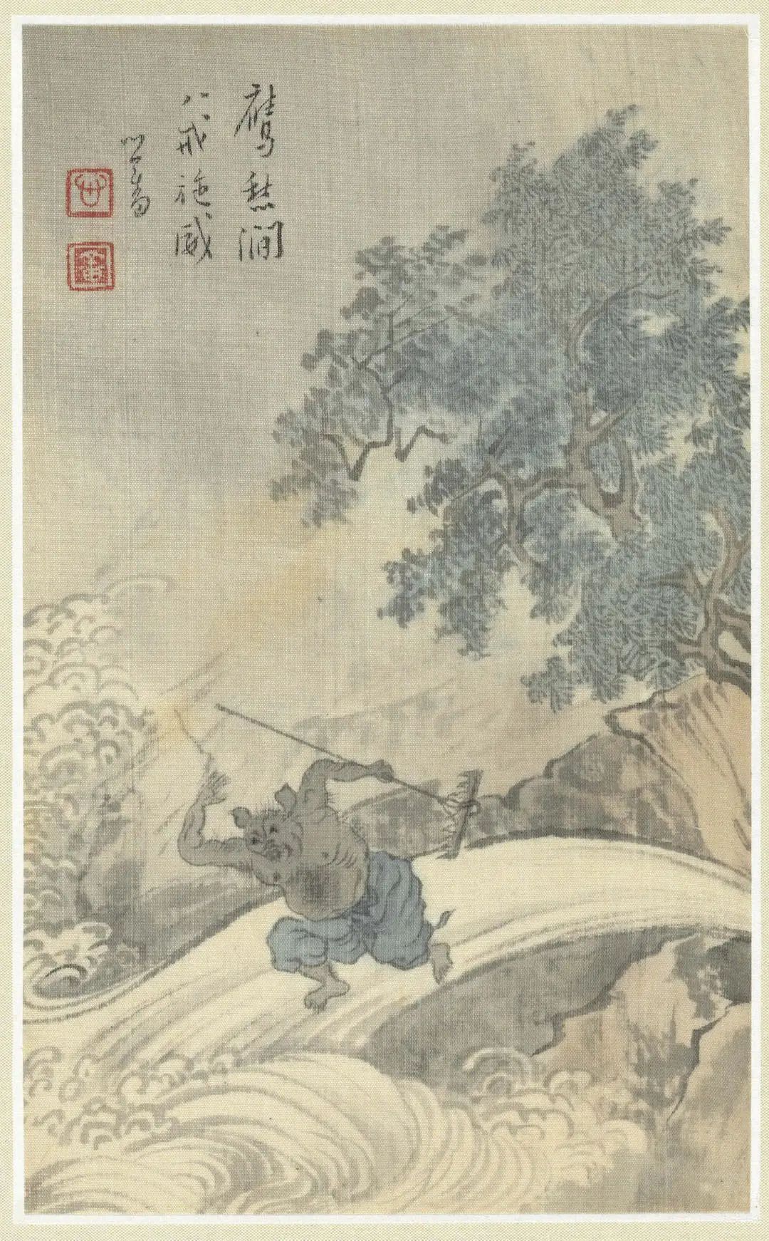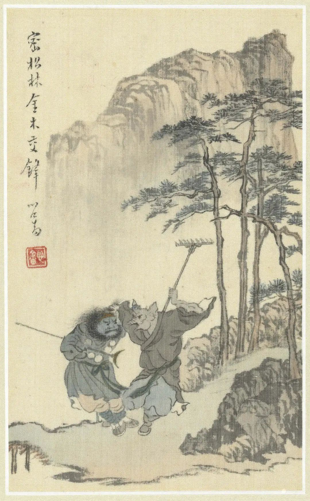 作为“南张北溥”的代表,溥儒将南宋马远“边角之景”的构图智慧与明代浙派的劲健笔法熔铸一炉。在“密松林金木交锋”中,猪八戒的憨态与沙僧的“痛苦面具”形成戏剧张力,而“悟能昼寝图”则以闲散姿态解构英雄叙事。这种雅俗共赏的幽默感,源自画家对京剧扮相的化用——黄袍怪的黄金铠甲与牛斗夜叉相,既保留戏曲程式化美感,又赋予妖怪世俗化的可爱特质。