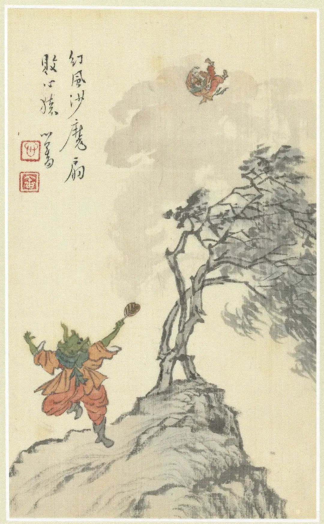 作为恭亲王奕訢之孙,溥儒的创作始终萦绕着末世贵族的苍凉感。“三藏求经度云山”中,师徒四人各具特色的形象设计,暗含对文化传承的焦虑;而“幻风沙魔扇败心猿”里悟空的狼狈姿态,则隐喻着传统文人在时代剧变中的精神困境。画家通过“旧王孙”印章的反复钤盖,将个人身份认同转化为文化符号,使每幅画作都成为解读清末民初知识分子心路的密码本。